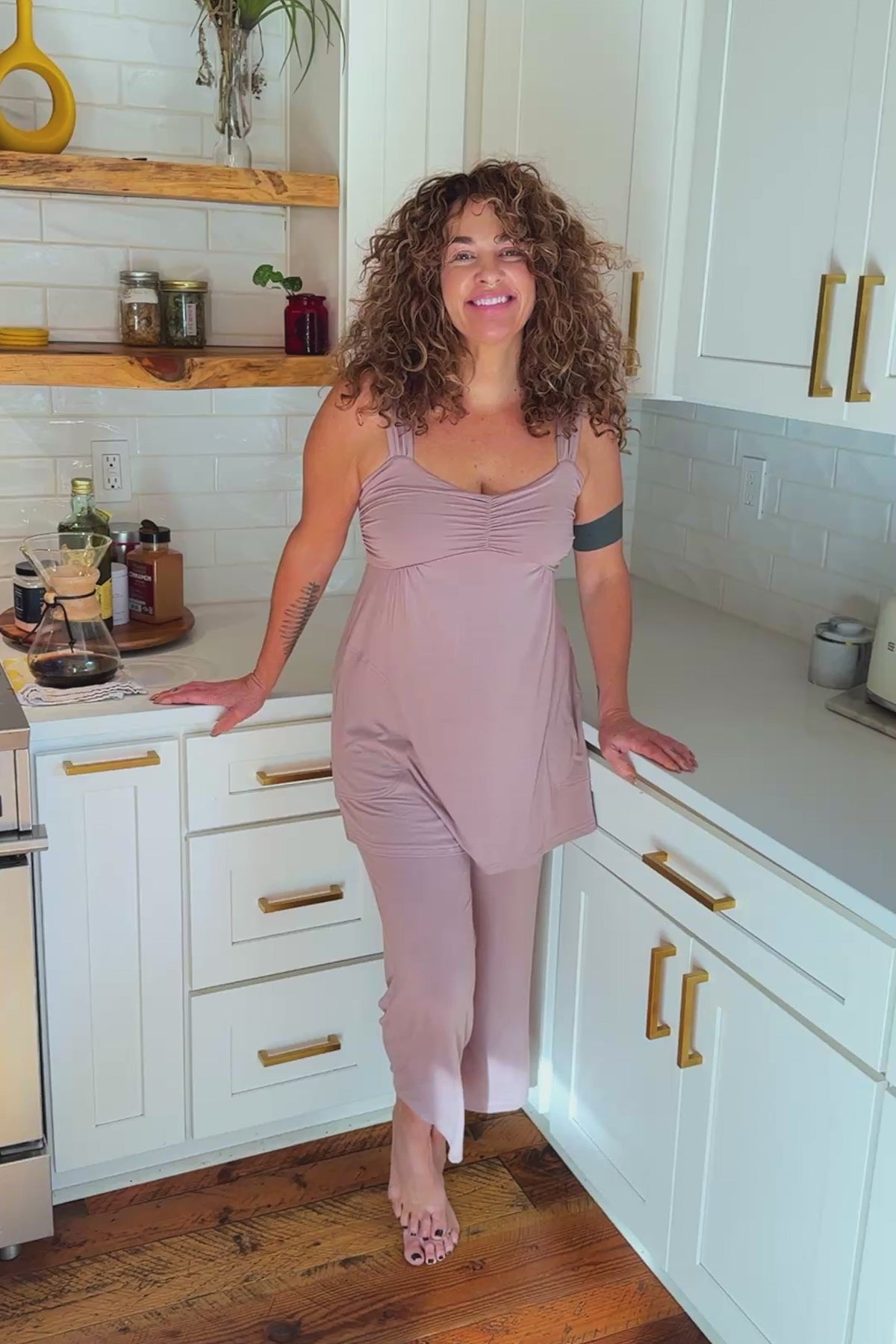 Das Cleo Pyjama-Set ist eine Weiterentwicklung des Originals und aus jedem Blickwinkel bezaubernd! Das Oberteil im Babydoll-Stil besticht durch einen geräumigeren, doppellagigen Brustbereich, schwereren Stoff, breite Träger, Taschen und eine Empire-Taille. Die verkürzte Hose hat einen weichen, elastischen Bund und eine V-Form, die Ihren Po schmeichelt.